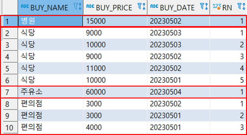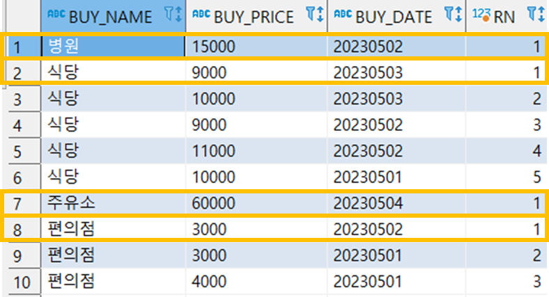 1) 구매 사용처(BUY_NAME) 별 그룹핑하여, 구매 일자(BUY_DATE)가 최근인 순서로 순번(RN)을 지정한다.